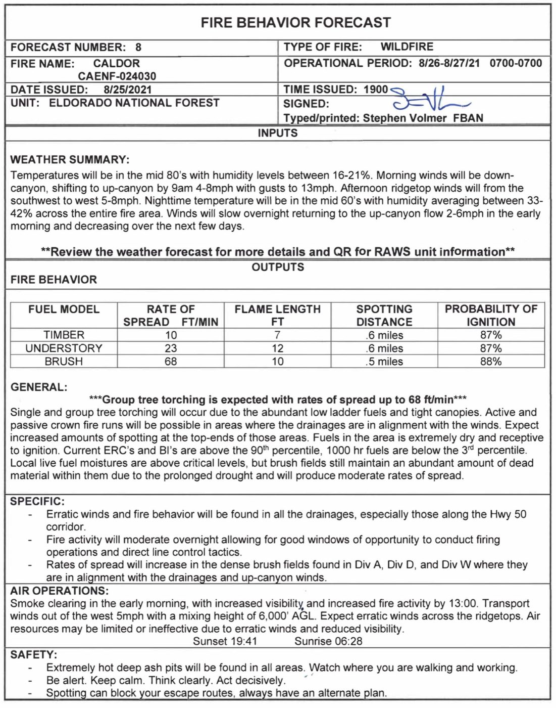 In the area around Meiss, there has been steady flanking spread, burning to the side of the fire and perpendicular to the direction of the winds. This spread is primarily the result of very heavy fuel loading in the forests here. Large hot flanks like these are dangerous because they can become a new head for the fire if we get a major wind shift, for example out of the northwest. This wind isn’t forecasted, but it’s worth pointing out. This area of the fire has been a lower priority for suppression because the limited resources are focused on protecting the highly developed areas along the Highway 50 Corridor and west of the fire.