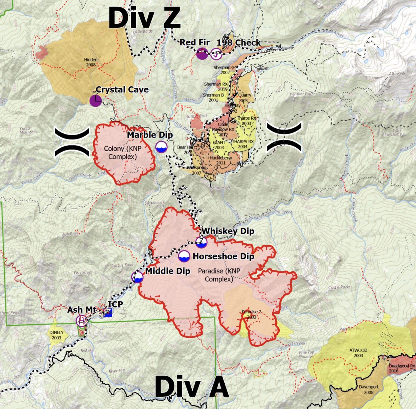 Interesting map showing historic fires and prescribed burns around KNP Complex: