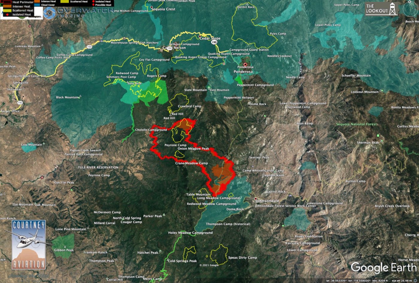 This morning’s map captions come from Ryan’s interpretation of overnight IR heat mapping flights. The longer narratives are from a retired Federal wildland firefighter who is local to the Southern Sierra fires.