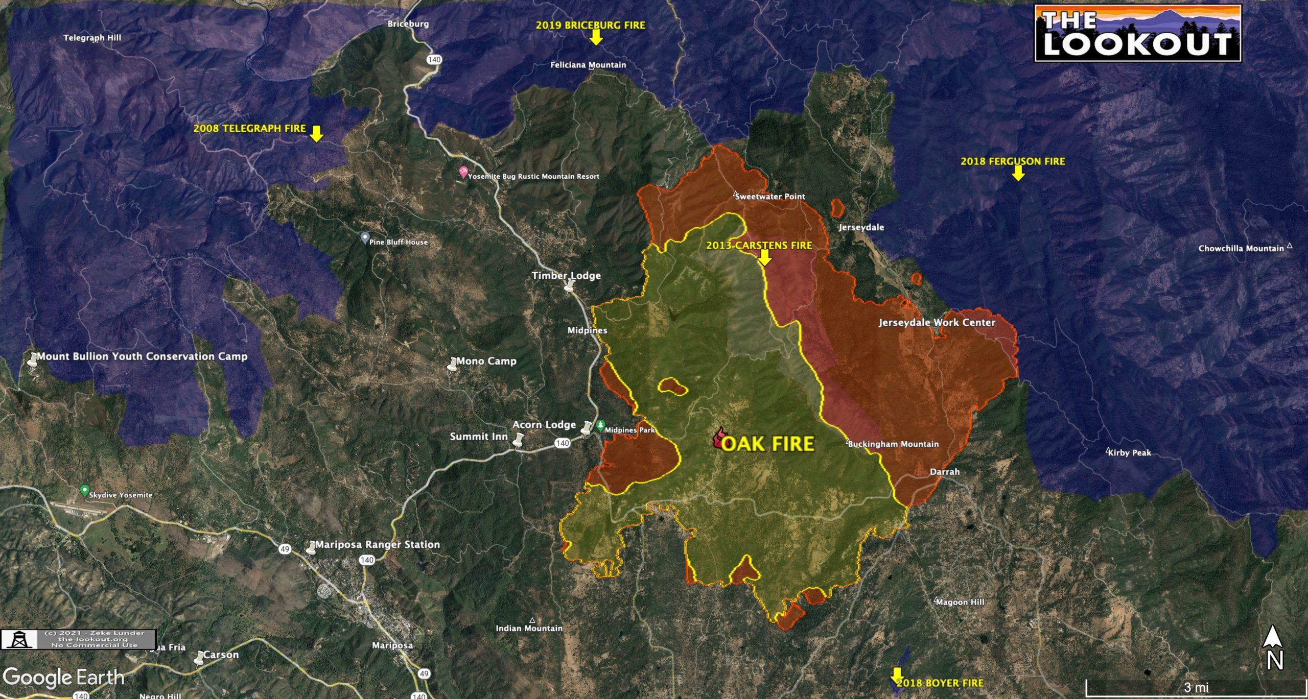 #OakFire overview: IR data captured 07/23/2022 @ 2246 PDT. Red fill shows where the fire is most active. Yellow fill shows where the fire is cooling down. Blue fill shows footprints for the past 20 years of previous fires in the targeted area.