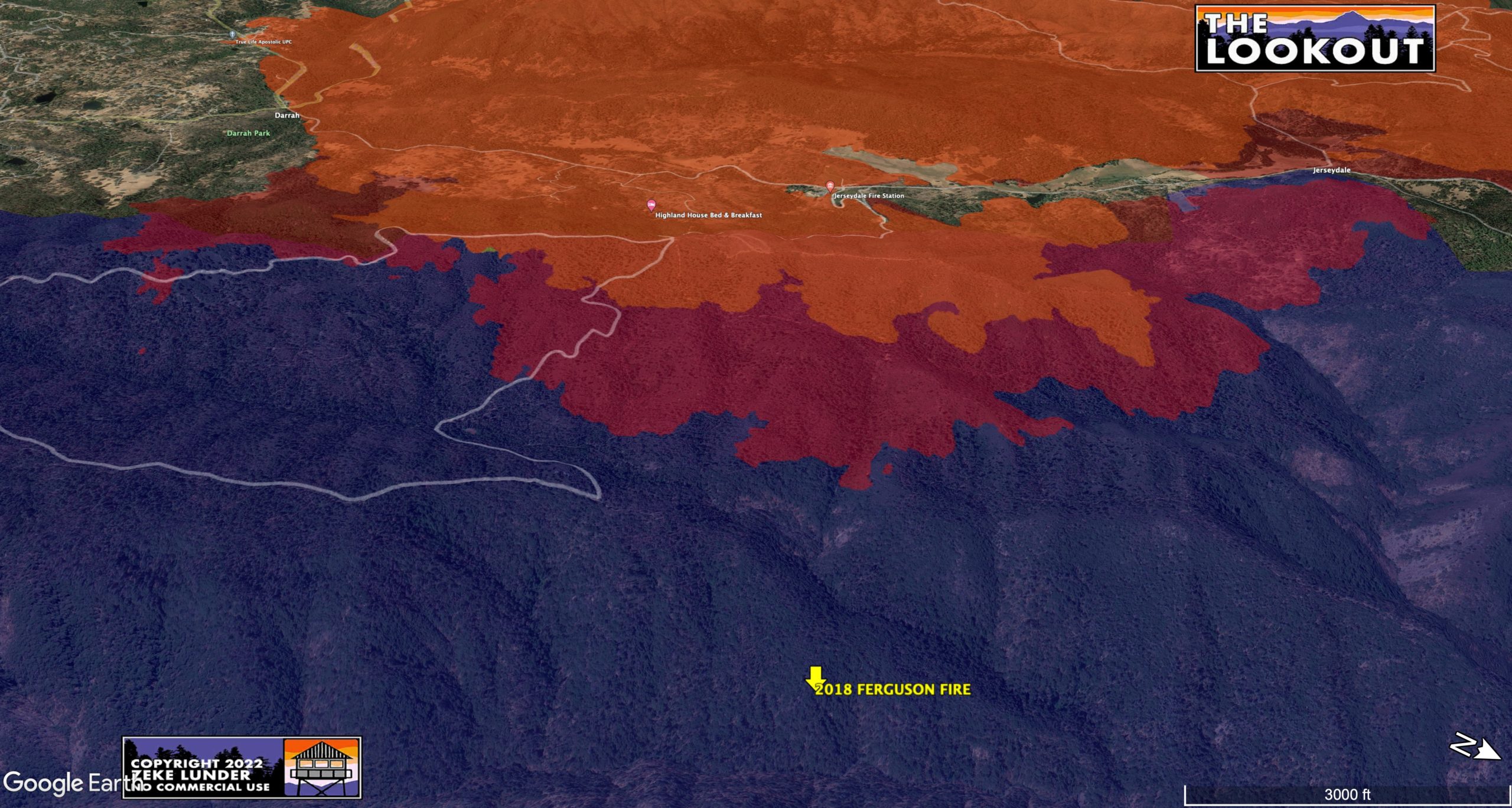 Looking northeast over the 140 and Ponderosa Way: Orange fill showing where the fire is cooling down.Looking South over Jerseydale: Fire was holding along Bear Clover Ln. in the lower right of the map. Fire in and along the Ferguson fire footprint east of Jerseydale and the Blue Glory Mine trailhead. Fire along both sides of Jerseydale Rd. above Jerseydale near Skelton Creek. Some of the fire growth in this area may be from firing operations.Looking West Southwest toward Jerseydale. Fire backing down canyon, well into the Ferguson fire footprint.Looking South toward Darrah Rd, near Deer Springs Rd.