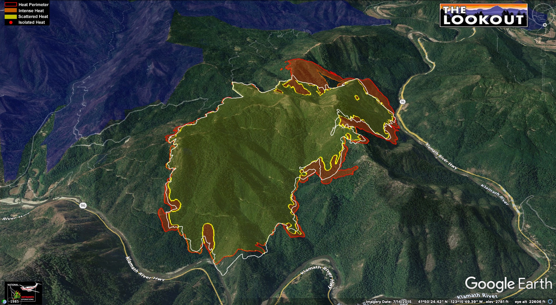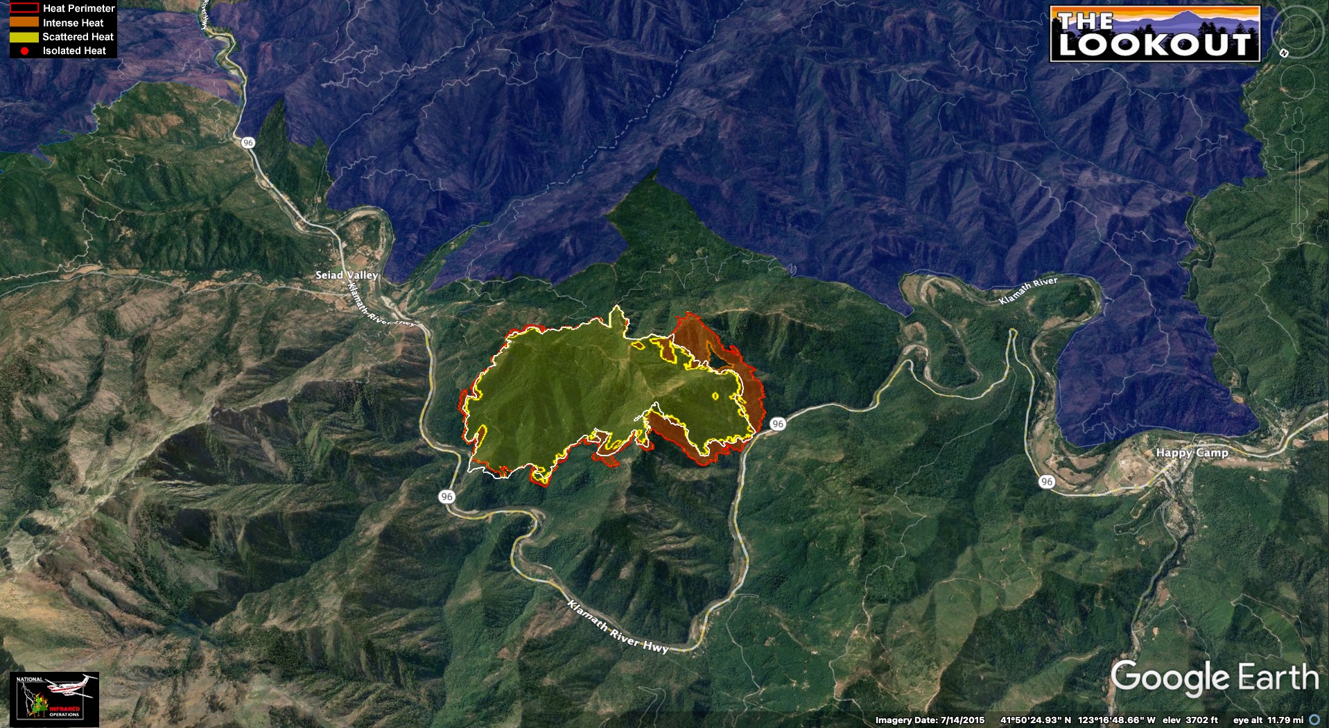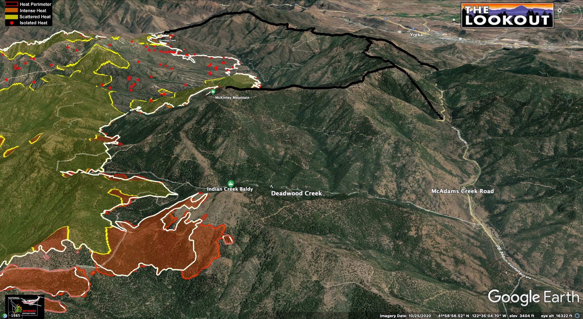 Looking northeast on the western side of the fire in divisions A and D. Growth throughout the fire has been subdued by recent precipitation and an increase in humidity. As things start to dry out, there’s an expectation of increased fire behavior.Looking north over Highway 96 on the Northwest side of the fire in division P and R. Red dots and red fill within the perimeter of the fire show isolated heat in unburned interior pockets, mostly along the south and east sides of the Klamath River. Flashy fuels in the 2014 Beaver Fire footprint continue to produce periods of growth.Looking south toward Yreka. More interior pockets of heat. Dozer line in BLACK appears to be nearing completion, except for a short but steep section connecting it in to Humbug creek near the Klamath river.Looking northeast over Indian Creek Baldy. Fire made a brief run in sparse available fuels up the northwest side of Indian Creek Baldy. Ridge top dozer lines in BLACK.
