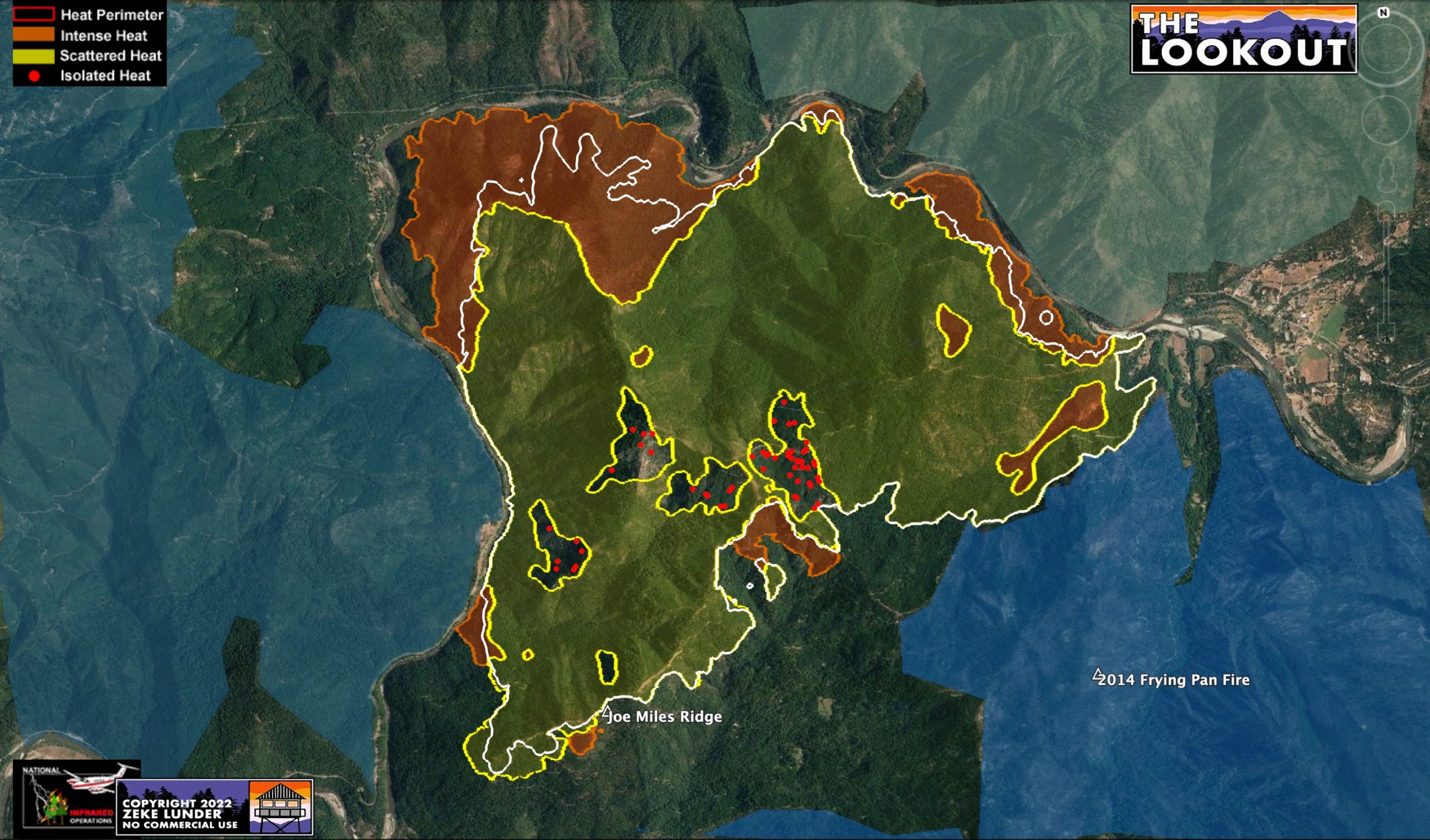 Here is a August 5, 2022 satellite image processed by The Lookout to show fire severity. Greenish/blue areas still have intact tree canopy. Brown areas burned hot.