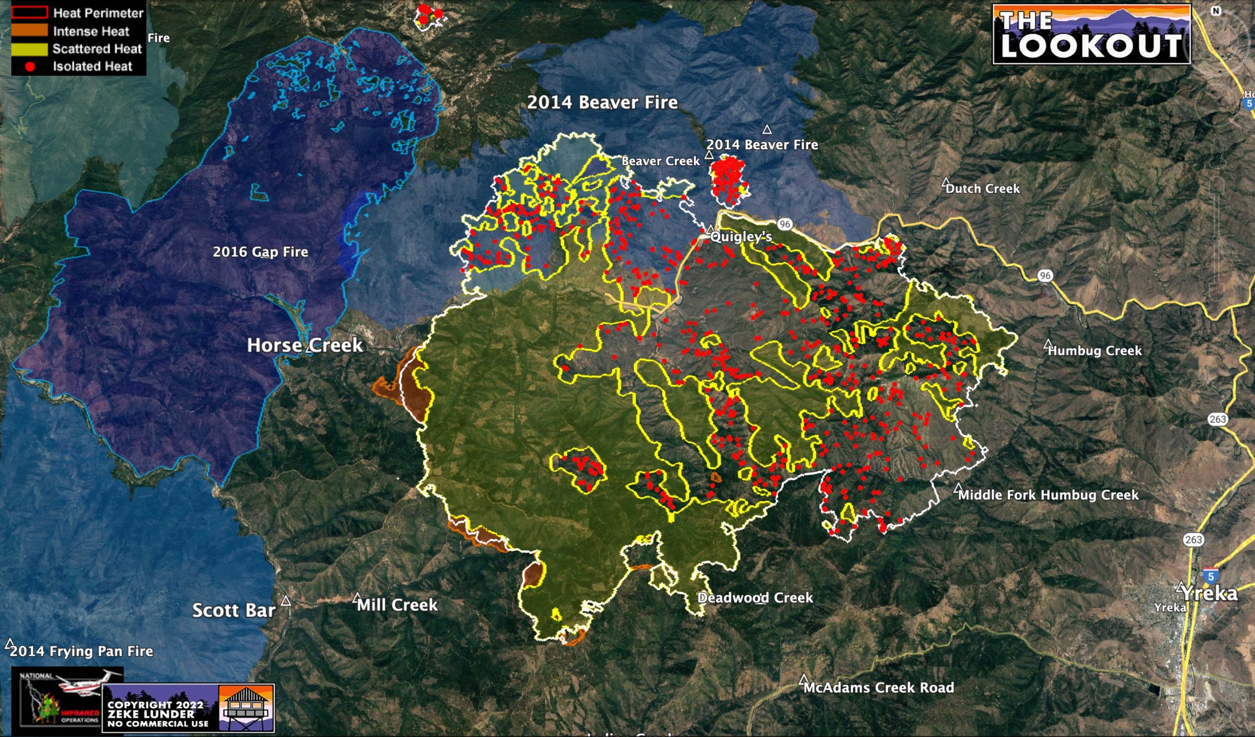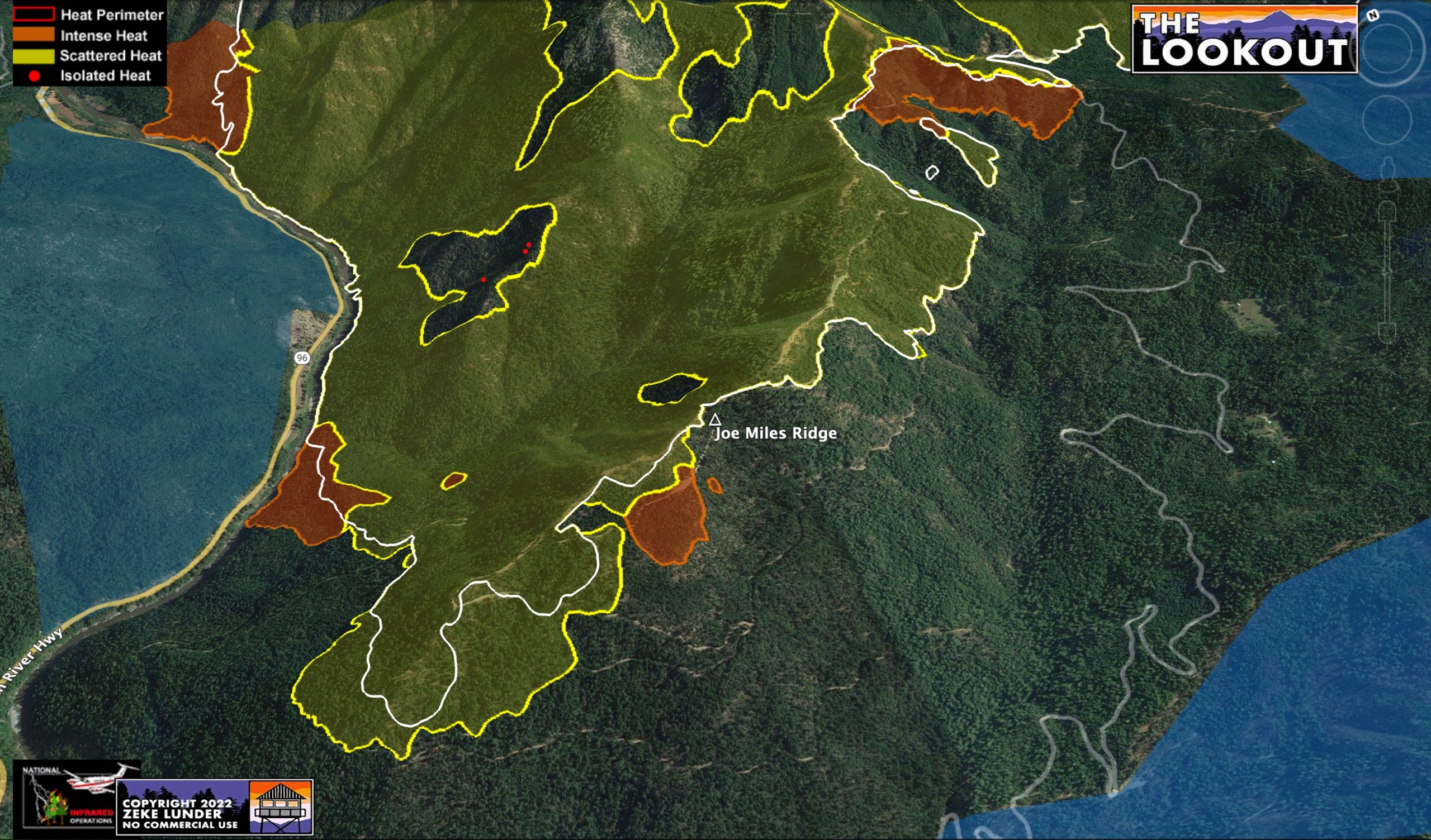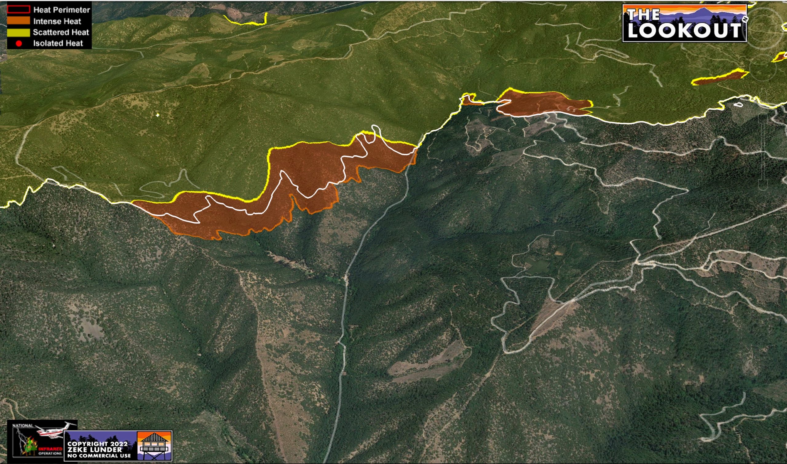 Here is a August 5, 2022 satellite image processed by The Lookout to show fire severity. Greenish/blue areas still have intact tree canopy. Brown areas burned hot.